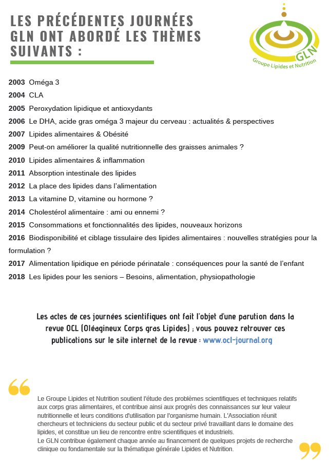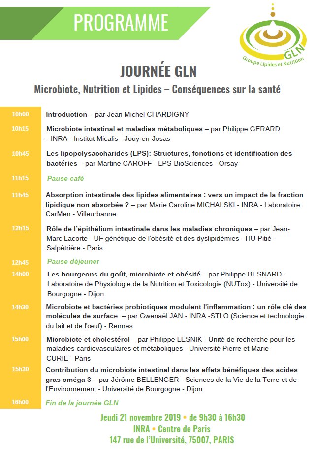 Sur la thématique : « Microbiote, Nutrition et Lipides – Conséquences sur la santé », le GLN a réuni 9 experts qui ont pu présenter leurs recherches devant 50 personnes.